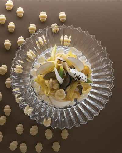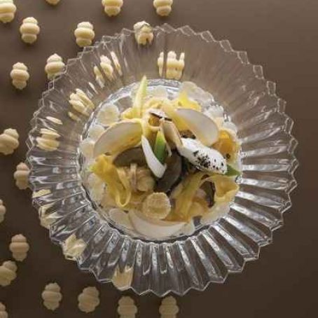 Ripartire la psta nei piatti, terminare aggiungendo le fettine di funghi porcini crudi e la ricotta al pepe in grani.