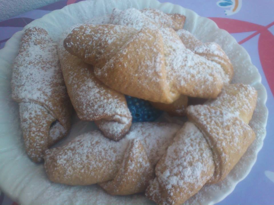 Tagliare dei triangolini di pasta mettere due cucchiaini di ripieno (o nutella o marmellata secondo i gusti) e arrotolare.