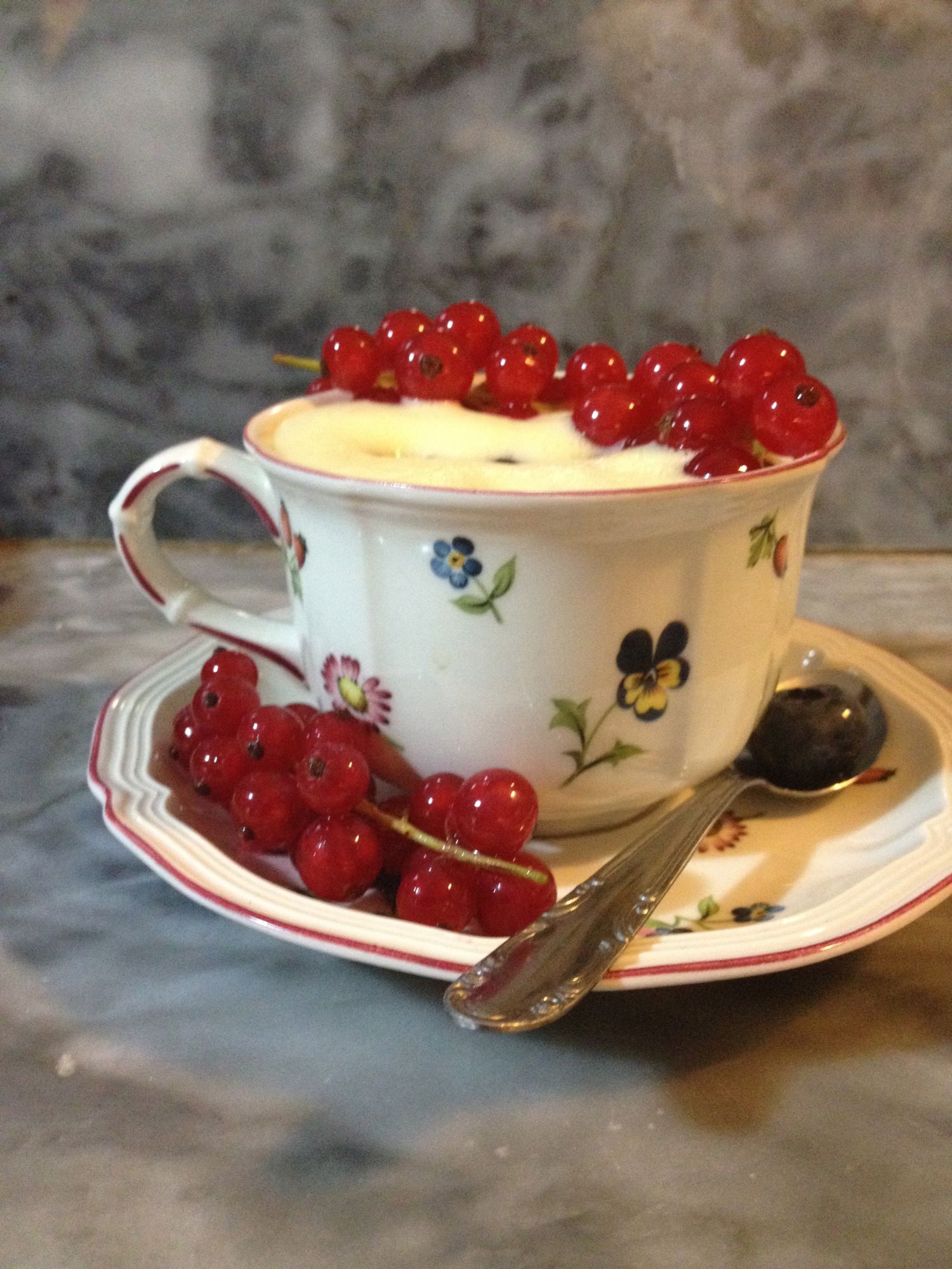 Intanto lavare i frutti di bosco. Metterne una parte nel fondo della nostra tazza. Porvi sopra una generosa quantità di crema chantilly e decorare con ribes o altri frutti a piacere.