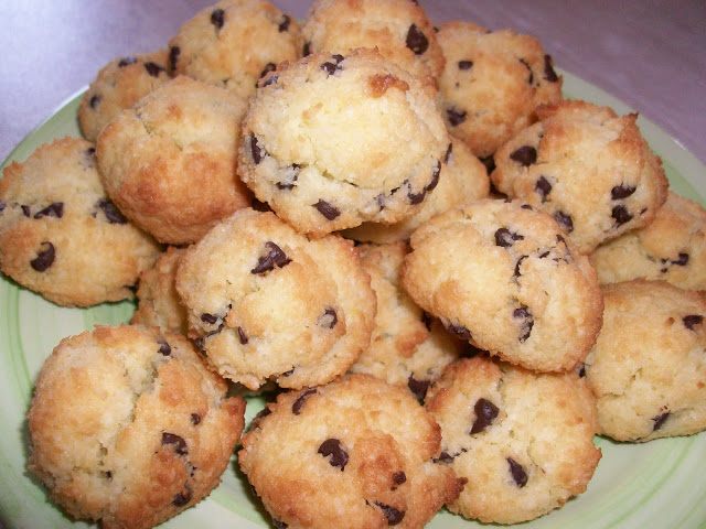 Impastare con le mani il cocco, lo zucchero, le uova, la farina e il burro morbido. Poi aggiungere le gocce di cioccolato e formare delle palline leggermente schiacciate.