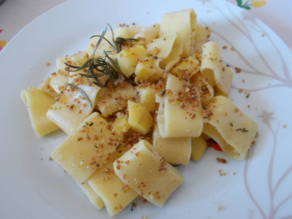 - 2 Spicchi di Aglio, Olio, 2 Patate, Rosmarino Qb, Sale, 3 Fette di Pane, Basilico Qb, 300 gr. di Mezze Maniche, Parmigiano Grattugiato Qb, Acqua di Cottura Qb.
