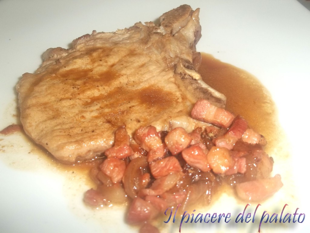 Prendere una pentola tonda e versare due cucchiai di olio evo e il quarto di cipolla tagliata fine. Farla appena appassire e poi aggiungere la pancetta. Una volta rosolata, prendere le bistecche di maiale, spolverare entrambi i lati con un pò di pepe nero in polvere. Mettere in pentola. Rosolare le bistecche e dopo qualche minuto aggiungere lo champagne. Far cuocere a fiamma bassa. Una volta asciugato quasi del tutto lo champagne, servire a tavola.