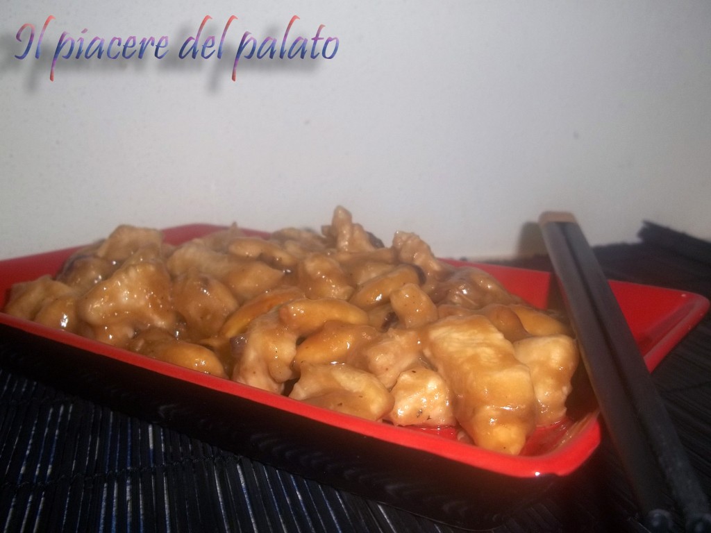 Mettere in una pentola 2 cucchiai di olio di semi e fare tostare le mandorle. Nel frattempo prendere il mezzo petto di pollo e tagliarlo a cubetti di circa un centimetro. Infarinare i cubetti di pollo. Togliere le mandorle tostate e metterle momentaneamente in un piatto. Nella stessa pentola aggiungere ancora 4 cucchiai di olio di semi e fare rosolare la cipolla tritata fine. Poi aggiungere il pollo a cubetti e continuare a far rosolare. Una volta rosolato in tutti i lati, aggiungere 3 mestoli di acqua e una spolverata di noce moscata. Quando il pollo è quasi cotto e la salsina addensata, aggiungere le mandorle e 4 cucchiai di salsa di soia. Mescolare ancora per qualche minuto e poi servire ben caldo.