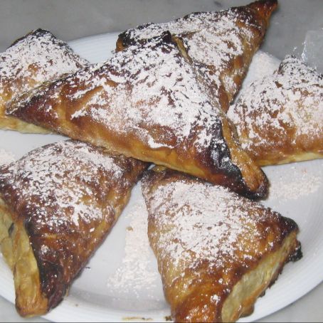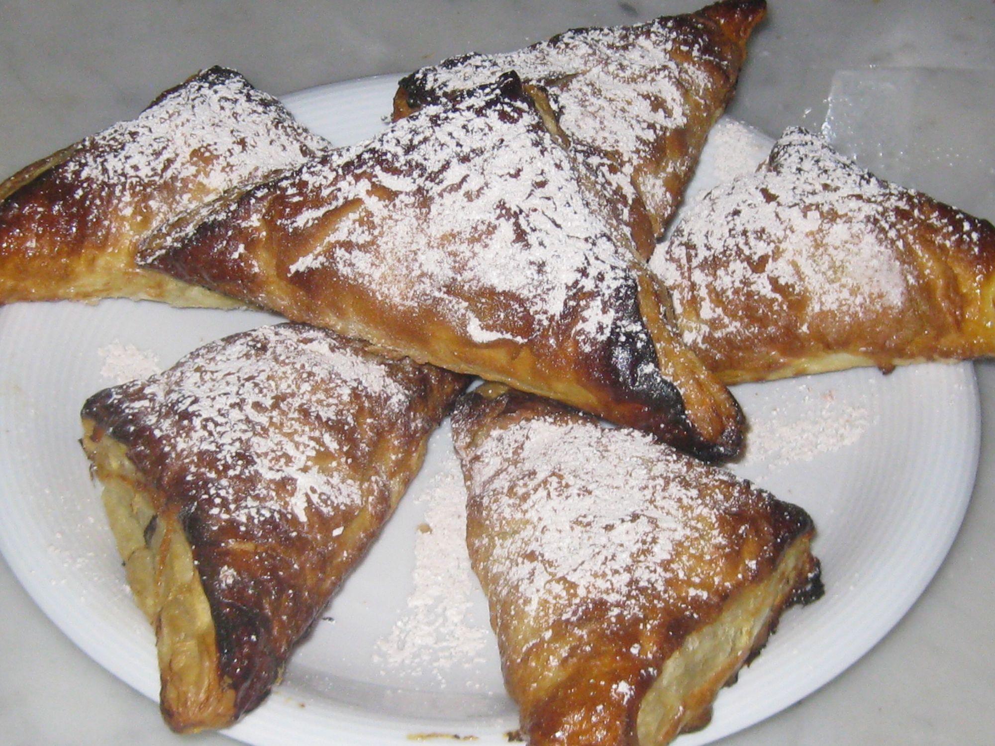 Suddividere le pere al centro dei quadrati di pasta e coprirle con il cioccolato tritato. Spennellare il perimetro della pasta con poco tuorlo sbattuto e ripiegarla ottenendo dei triangoli. Sigillare bene i bordi esercitando una pressione con le dita, Spennellare la superficie con il restante tuorlo e cospargere con poco zucchero