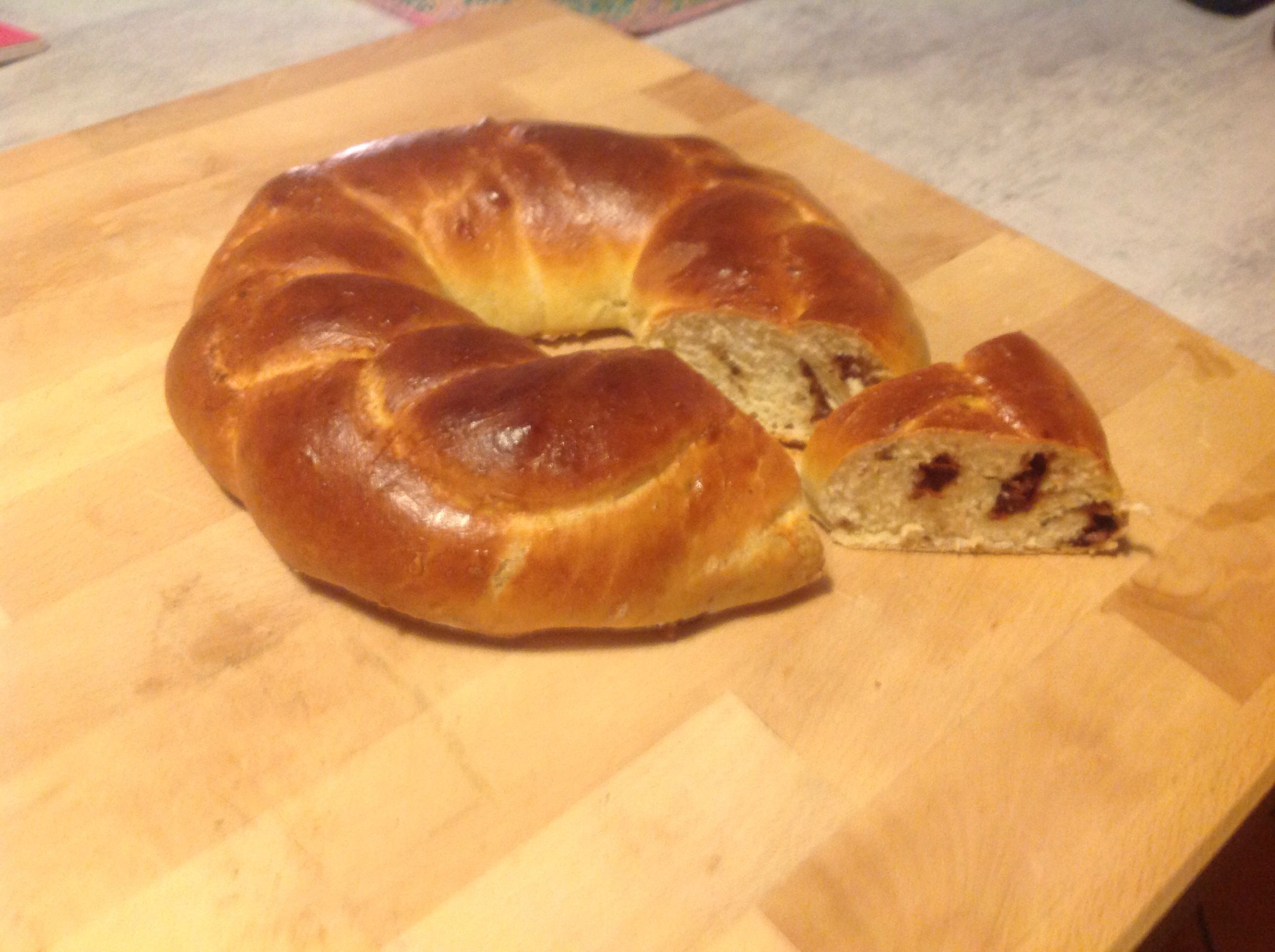 Trascorso il tempo di lievitazione, riprendete il panetto, stendetelo su una spianatoia a formare un rettangolo, da cui ricaverete tre strisce uguali. Farcite tutte le strisce con uguale quantità di composto(prosciutt, formaggio ed olive), e arrotolate ogni striscia per fromare un cilindro. Infine unite insieme tra loro i tre cilindri ottenuti al fine di formare la classica treccia. Se avete la possibilità, vi consiglio di eseguire questa operazione già sulla placca da forno, per evitare che la teccia si rompa nel passaggio, diversamente prendetela con molta cautela. Spennellate con l’uovo sbattuto ed infornate in forno caldo, 200° per 30 min. circa.