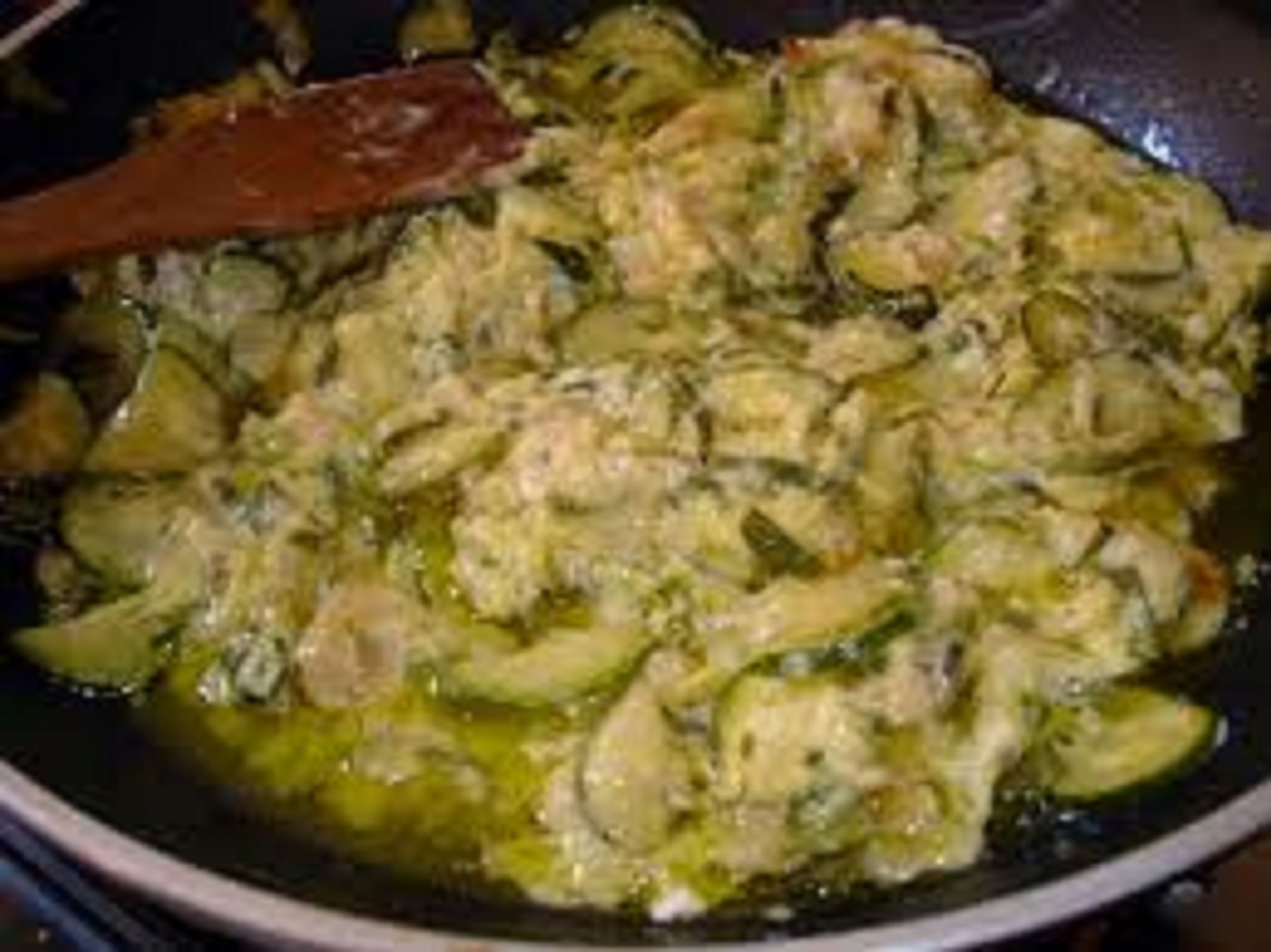 Pulite e tagliate a cubetti le zucchine: mettetele a cuocere in una padella dove avete fatto soffriggere la cipolla tagliata a pezzettini sottili.