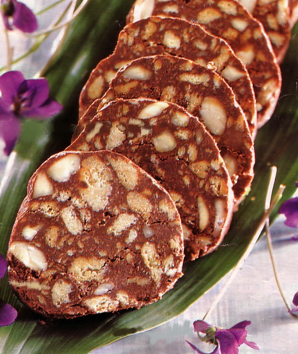 Sbriciolare i biscotti secchi fino a ottenere pezzi di piccole dimensioni. Lasciare ammorbidire il burro a temperatura ambiente. Sciogliere a bagno maria il cioccolato fondente mescolandolo di tanto in tanto e prevenendo la formazione di grumi. Ammorbidire il burro in una terrina fino ad ottenere un impasto cremoso. Aggiungere a poco a poco il cioccolato sciolto e ormai freddo, lo zucchero e le uova. Unire al composto i biscotti sbriciolati e mescolare. Porre l'impasto in un foglio di carta di alluminio e dare la forma di un salame.