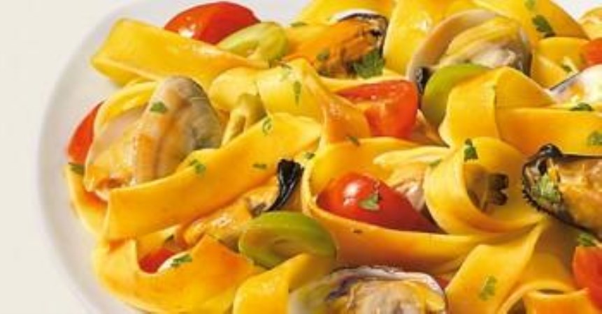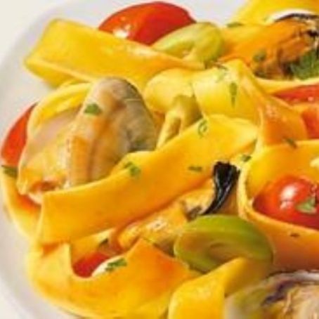 Fettuccine con vongole, cozze e olive verdi