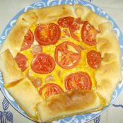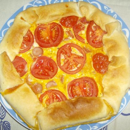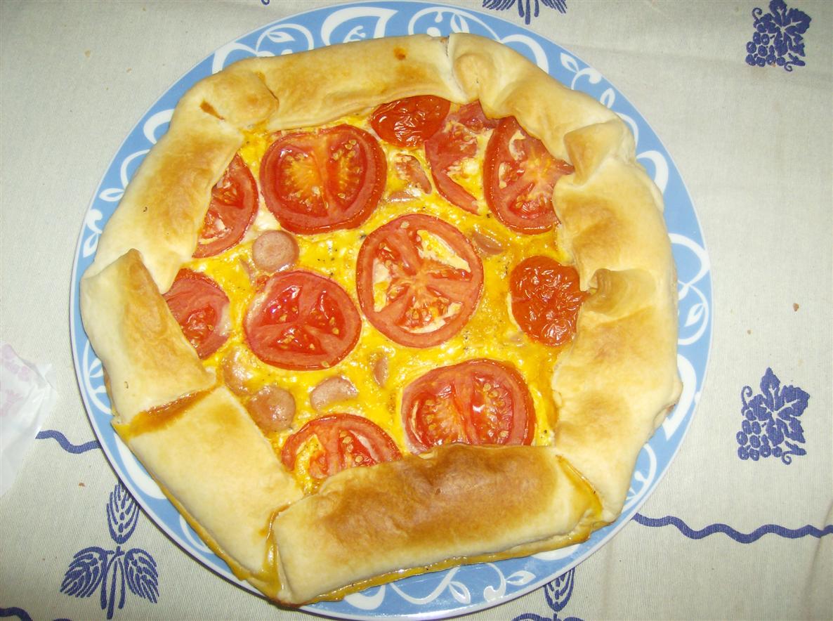Srotolare la pasta brisee e metterla in una tortiera, con una forchetta bucherellare il fondo. Accendere il forno e portarlo a 180°, nel frattempo rompere le uova in una ciotola mettere i wurstel tagliati a rondelle e la forma e mescolare. Versare il composto nella tortiera, tagliare i pomodori a fettine ed adagiarli sopra il composto salare e piegare la pasta in eccesso sopra il composto, infornare per circa 45 minuti.