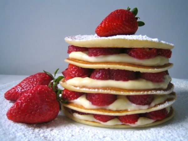 Prendere il mezzo bicchiere di latte messo da parte e aggiungerlo a filo continuando a mescolare per evitare i grumi. Una volta versato tutto il latte spegnere il fuoco. montare la panna e aggiungerla alla crema. Farcire i pancakes con la crema ottenuta e le fragole