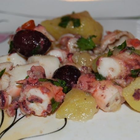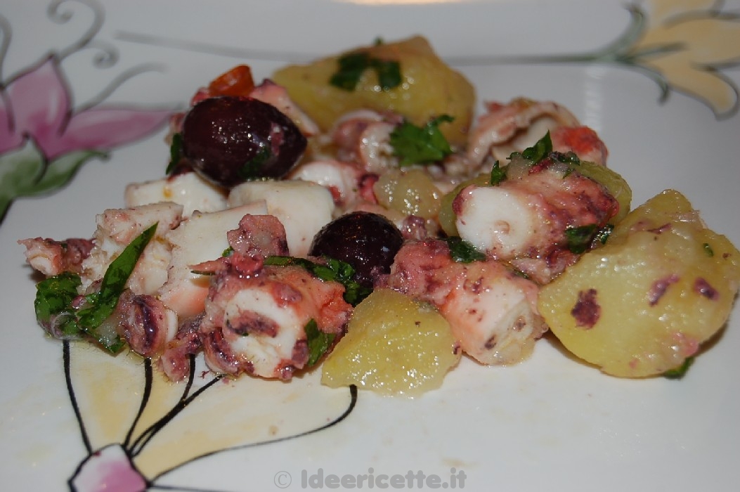 Mettere il polpo per 30 minuti nel congelatore, poi immergerlo 3 volte nell'acqua bollente, infine lasciarlo a bollire in acqua per con grani di pepe e gambi di prezzemolo finché non si ammorbidisce.