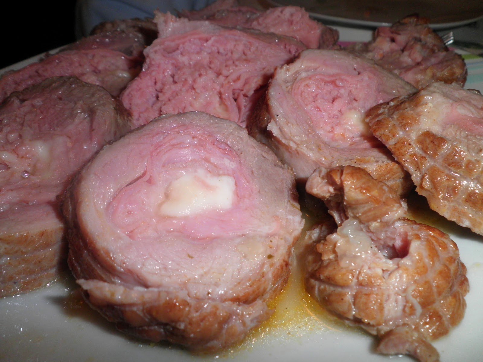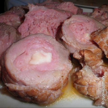 Tritate il prosciutto con il rosmarino, l’aglio e la salvia. Salate e pepate la polpa di maiale, copritela con la mortadella , la scamorza e su questi distribuite il trito preparato.Arrotolate la carne su se stessa e legatela stretta.