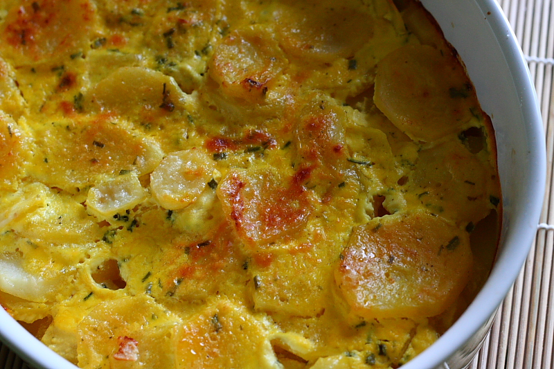 Cuoci in forno. Copri la pirofila con un foglio di alluminio e cuoci nel forno già caldo a 180° per circa 40 minuti. Togli l'alluminio e distribuisci sulla superficie qualche fiocchetto di burro. Alza la temperatura del forno a 200°e rimetti il gratin in forno per almeno 20 minuti, finchè la superficie risulterà uniformemente dorata e le patate saranno cotte.