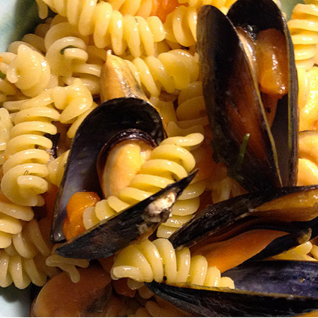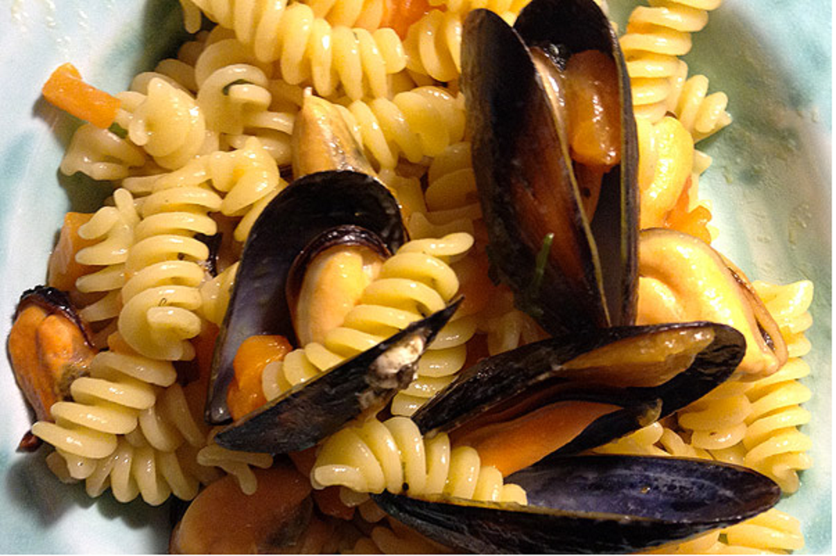 Si aggiunge alla zucca un mestolo di acqua filtrata e le cozze sgusciate