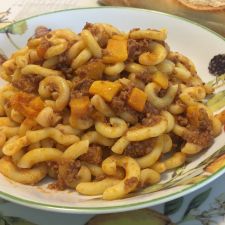 Appena l'aglio diventa rosato togliere il tutto ed aggiungere la zucca tagliata a dadoni e salare.