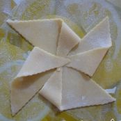 Con un matterello stendere l'impasto in una sfoglia rettangolare spessa 3 mm circa, ritagliare dei quadretti di 6 cm di lato.