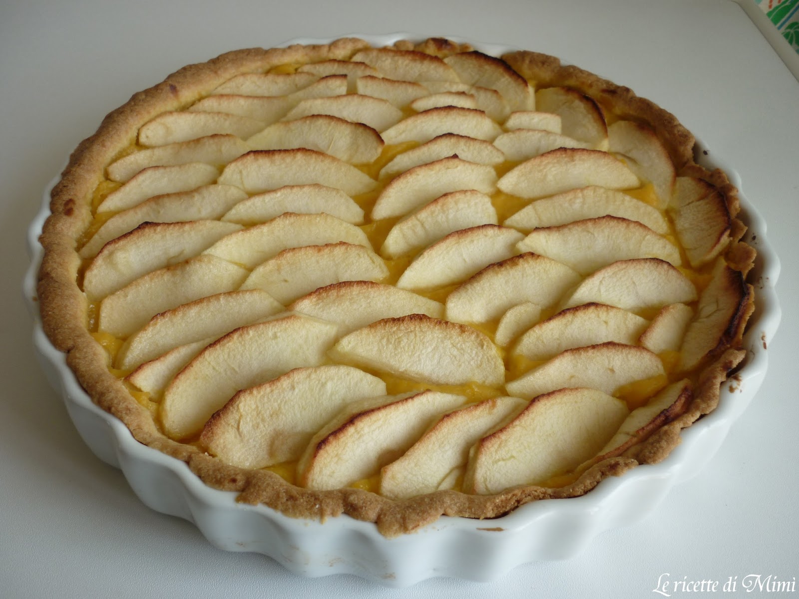 Coprire il fondo di pasta con un foglio di carta di alluminio, cospargerla di fagioli secchi e cuocere la torta in forno caldo a 220°C per 15 minuti. Dopodiché toglierla dal forno, eliminare carta e fagioli, disporvi sopra le fettine di mela in file parallele, sovrapponendole leggermente in modo da coprire tutta la base della torta.