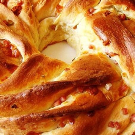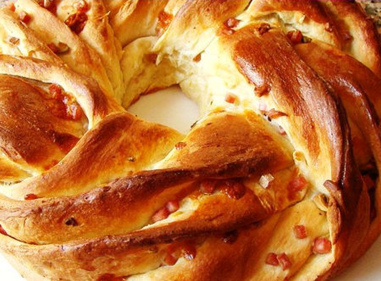 Porre su una teglia da forno e farla lievitare tenendola coperta per 30-40 minuti (deve quasi raddoppiare), poi spennellare con l'uovo sbattuto col latte e cuocere in forno a 180° per circa mezz'ora (deve essere ben dorata).