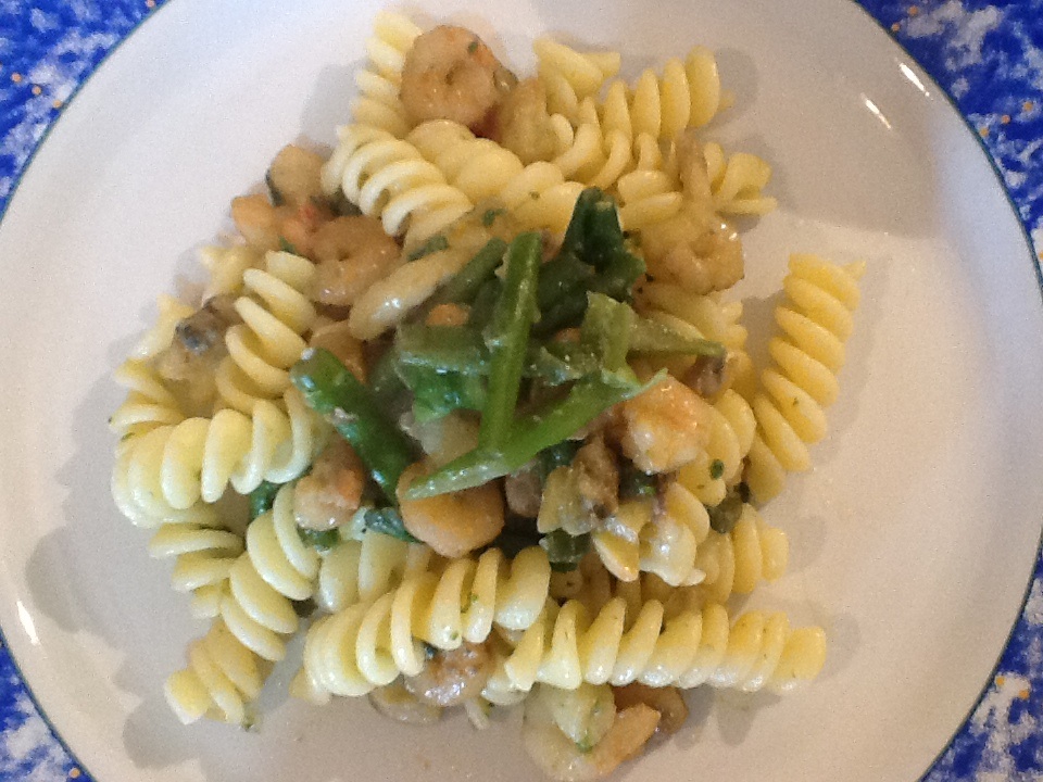 Non appena la pasta è cotta , versare nella padella con gli asparagi e i frutti di mare e mantecare il tutto.
