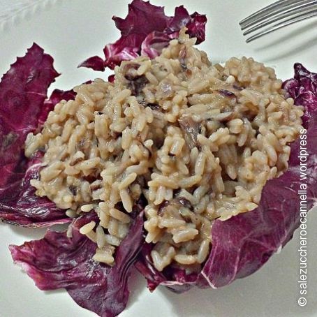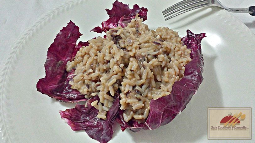 Tritare la cipolla e il radicchio, metterli a rosolare insieme con un cucchiaio d’olio, per qualche minuto. Gettarvi il riso, farlo tostare per un minutino, sfumare col Vinchef (o con vino bianco) e far evaporare. Quindi aggiungere metà brodo bollente e mescolare di tanto in tanto. Se il brodo si asciuga prima che il riso sia cotto, aggiungerne altro poco per volta fino a cottura ultimata. Tenete presente che il risotto dev’essere all’onda, cioè cremoso, quindi non fate asciugare troppo il liquido. All’ultimo aggiungere il parmigiano e mantecare. Impiattate ancora fumante, magari servendolo su una foglia ben lavata di radicchio, come nella foto.