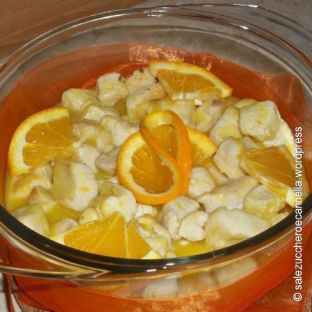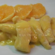 Tagliare le fettine di tacchino a tocchetti e infarinarle per bene. Scuotere l’eccesso di farina e far rosolare la carne in padella con un pò d’olio evo. Spremere le arance e mettere da parte il succo.
