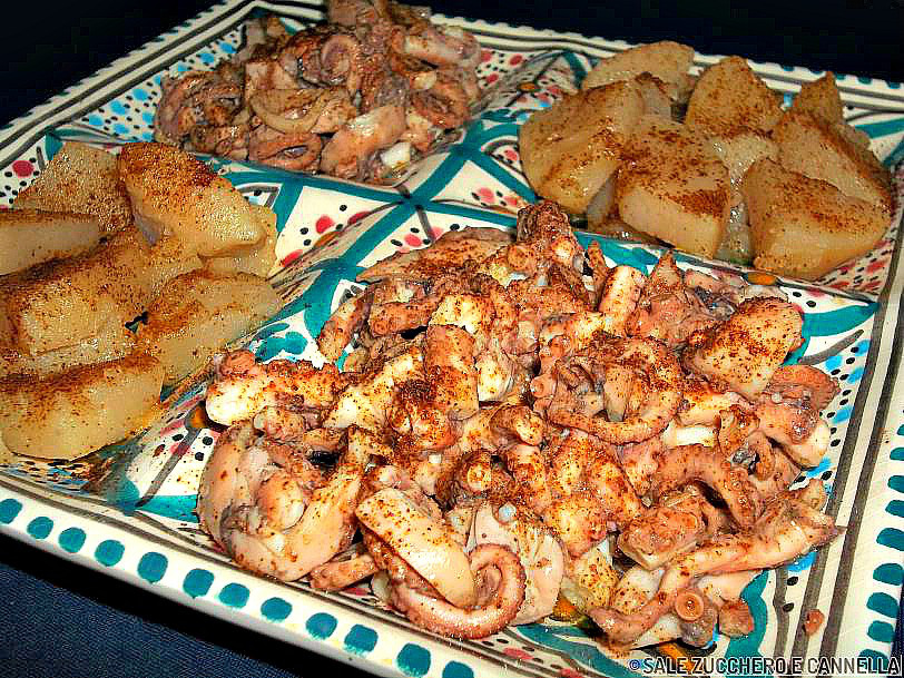 Nella stessa acqua di cottura buttate un pugnetto di sale grosso e tuffate le patate precedentemente sbucciate e tagliate; fatele cuocere per circa 5 -10 minuti (a seconda della grossezza). Scolatele e fatele raffreddare. In piattini separati condite il polpo con abbondante olio evo, paprika dolce o piccante a seconda dei gusti e qualche chicco di sale grosso; per le patate usate sempre olio e paprika ma omettete il sale, che avevate già messo nell’acqua di cottura.