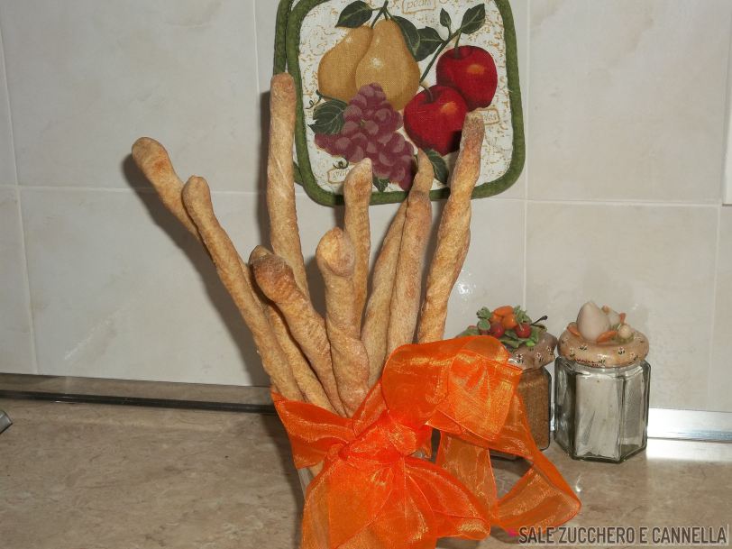 Trascorso il tempo di lievitazione tagliare delle strisce di pasta dal panetto, e lavorarle una per una attorcigliandole su se stesse e tirandole delicatamente per allungarle. Disporre i bastoncini ottenuti su una teglia con carta da forno oliata e infornare in forno ventilato preriscaldato a 220° per circa 15 minuti.
