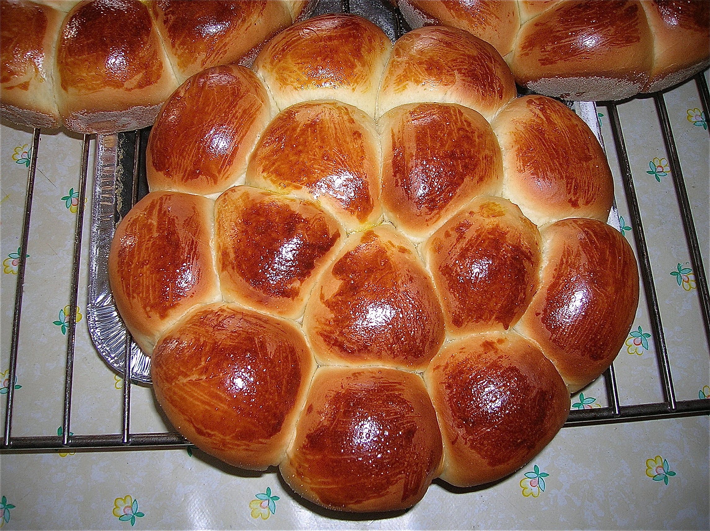 Spennellare la superficie dei panini con del tuorlo e cuocere in forno caldo a 180° per 20-30 minuti.