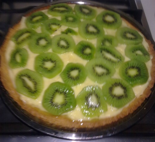 Raccogliete la crema pasticera in una sac à poche e distribuitela sul fondo della crostata.Affettate la frutta di stagione ( kiwi, banane, mandarini, uva, etc..) e disponetele in modo ordinato sullo strato di crema. Spennellate la frutta con della gelatina neutra (Tortagel Pan degli Angeli)