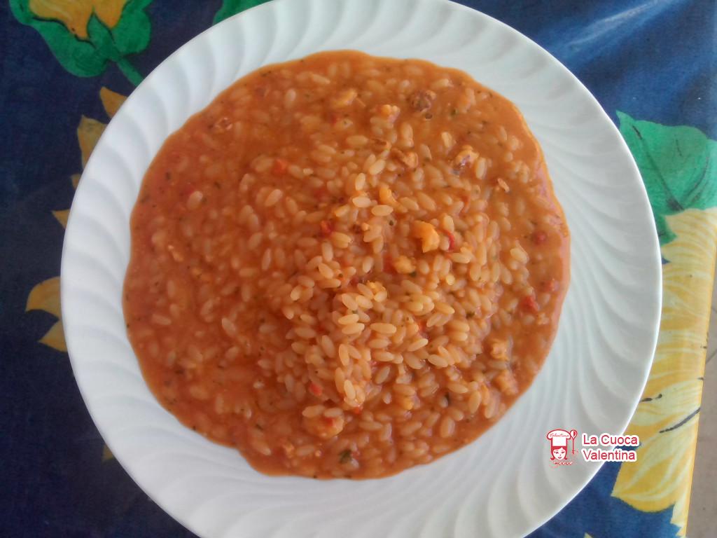 Per preparare il brodo vegetale, bisogna portare a bollore l’acqua e sciogliere il dado. Spegnere e mettere da parte. In una pentola capiente sciogliere una noce di burro e soffriggere cipolla, aglio e peperoncino. Unire i frutti di mare e cuocere a fuoco basso, mescolando ogni tanto. Verso fine cottura, unire il sugo e cuocere per altri 5-10 minuti, quindi spegnere. In un’altra pentola, sciogliere un’altra noce di burro, versare il riso e tostarlo a fuoco medio per 3-4 minuti, mescolando per non far bruciare. Sfumare con vino bianco e portare a cottura, aggiungendo pian piano il brodo vegetale. Salare e pepare. Verso gli ultimi 5 minuti, unire il condimento , mescolare e portare a cottura. Servire caldo, anche con una spolverata di formaggio grattugiato.