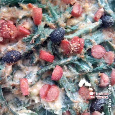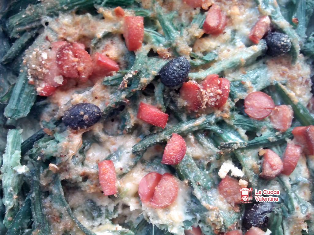 Il gratin di cardi è un piatto unico a base di verdura, besciamella, formaggio e salumi. Io ho usato i wurstel, ma posso essere sostituiti con pancetta o mortadella. E’ un piatto che può essere preparato durante tutto l’anno: in inverno possono essere usati i cardi freschi, durante l’estate invece quelli surgelati.