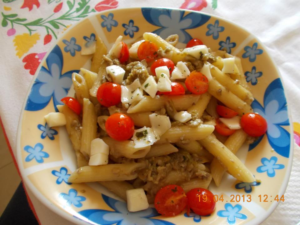 Condisco la pasta con il pesto di olive e completo con i pomodorini e la mozzarella tagliata a dadini.