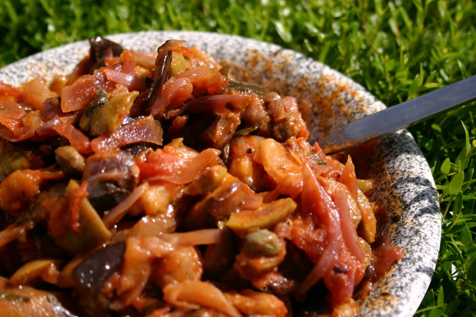 Levare le melanzane dal fuoco ed aggiungerle al soffritto .Fare cuocere per 7 minuti. Aggiungere 1/2 bicchiere di aceto bianco ed un cucchiaio di zucchero.Aspettare che tutto il composto arrivi nuovamente ad ebollizione.Poco prima di scendere il composto dal fuoco, aggiungere qualche foglia di basilico crudo.
