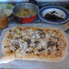 Preriscaldate il forno a 180°. Tagliate la mela a fettine fine. Mescolate in una ciotola l'uvetta, la farina di mandorle, lo zucchero di canna, la farina e la cannella. Stendete il rotolo di pasta sfoglia e aggiungeteci le mele al centro. Con un coltello appuntito, tagliate la pasta su ogni lato delle mele. Fate dei tagli sulla superficie, distanziati di 2 cm l'uno dall'altro. Iniziate ad intrecciare la pasta partendo dalle estremità e portandole verso il centro, accavallando le bande di pasta.