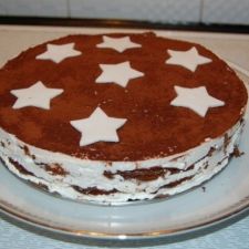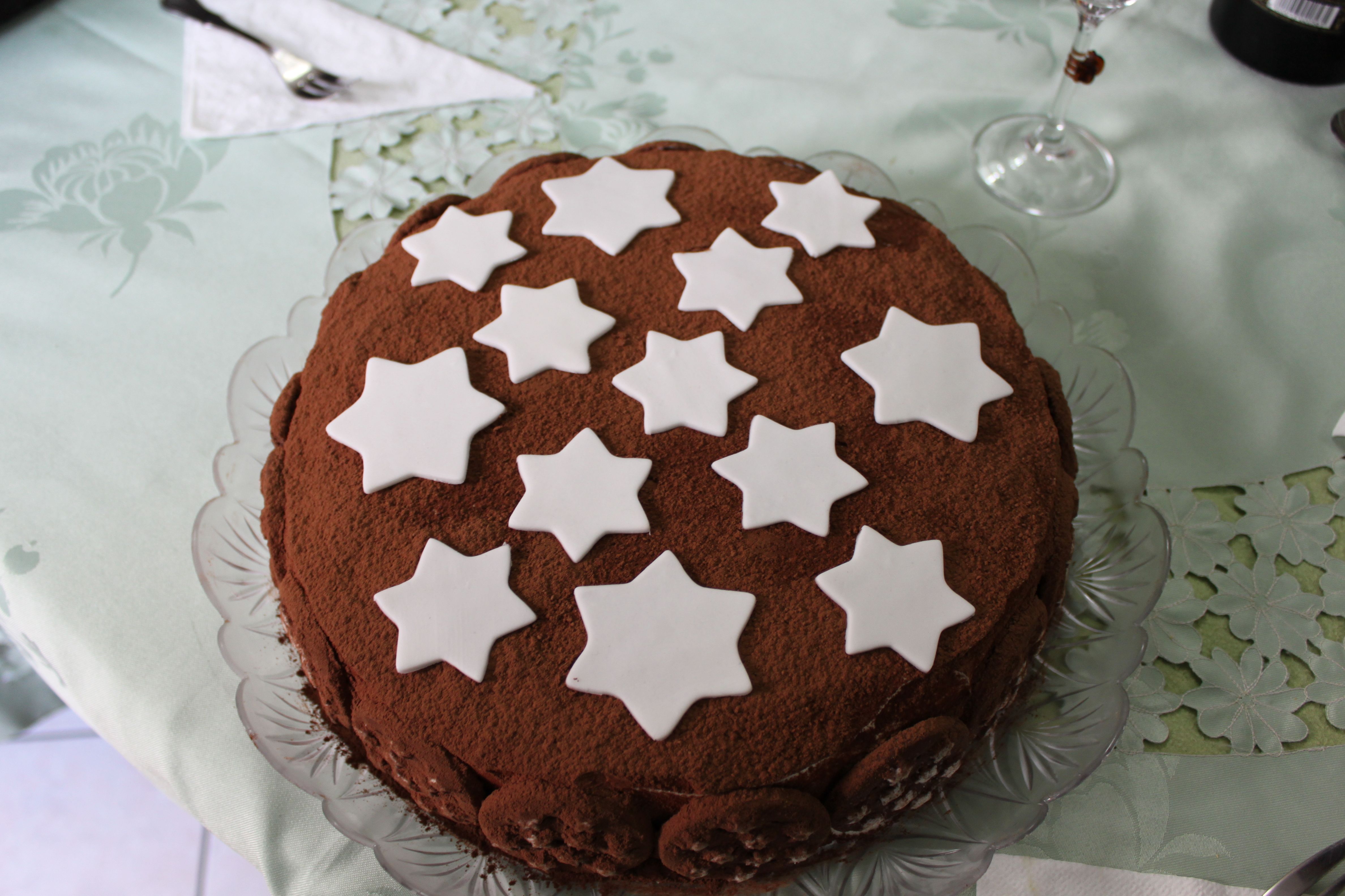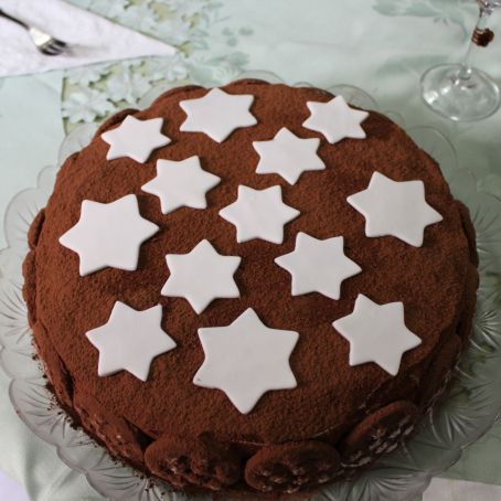 Setacciare il cacao amaro su tutta la torta. Con il pan di zucchero creare delle stelle e posizionarle sulla torta.