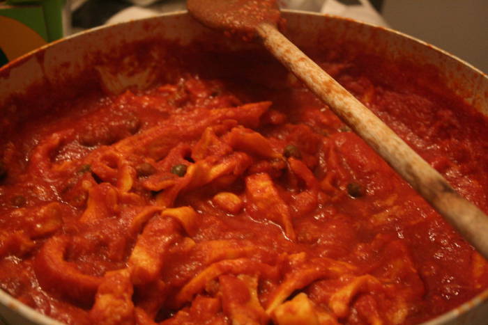 Soffriggere la cipolla, aggiungere i pelati e il sale e cuocere per circa 15 min.