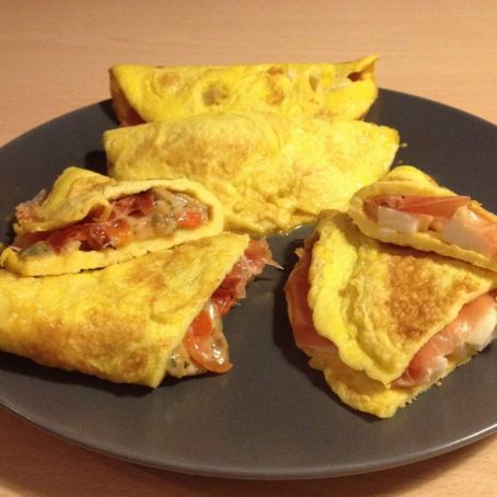 Stacca l'omelette, falla scivolare su un piatto da portata, distribuisci sopra bacon e funghi e ripiega la parte non farcita!
