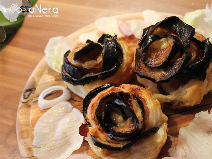 Richiudere la sfoglia a metà, quindi arrotolarla su se stessa fino a formare una rosa. Poggiate le rose di melanzane su una teglia rivestita di carta forno, poi cospargetele con un filo d’olio ed infornate in forno già caldo a 200°.