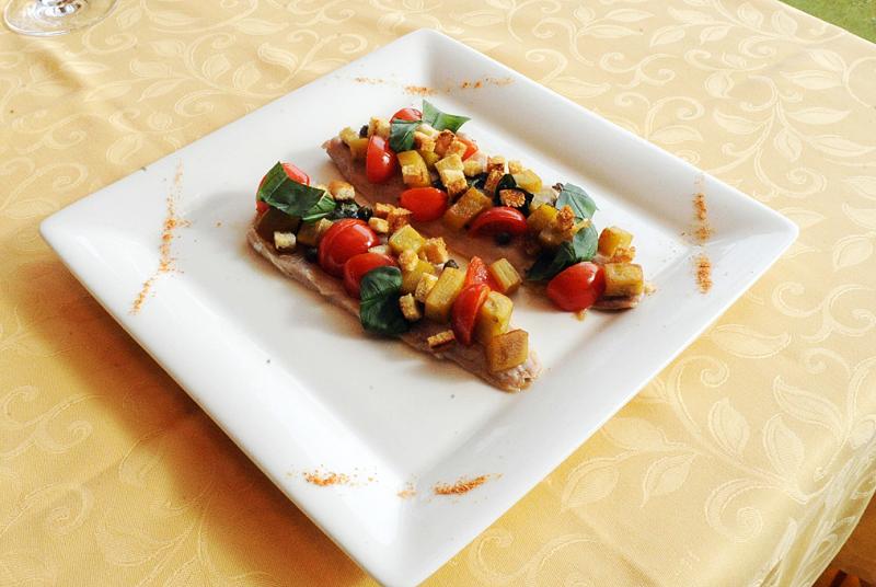 Scaldare tre cucchiai di olio in padella con le acciughe e i capperi, spegnere la fiamma e aggiungere i pomodori spellati e a dadini, la melanzana a cubetti precedentemente scottata in padella e le foglie di basilico spezzettate. Aggiustare di sale.