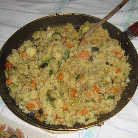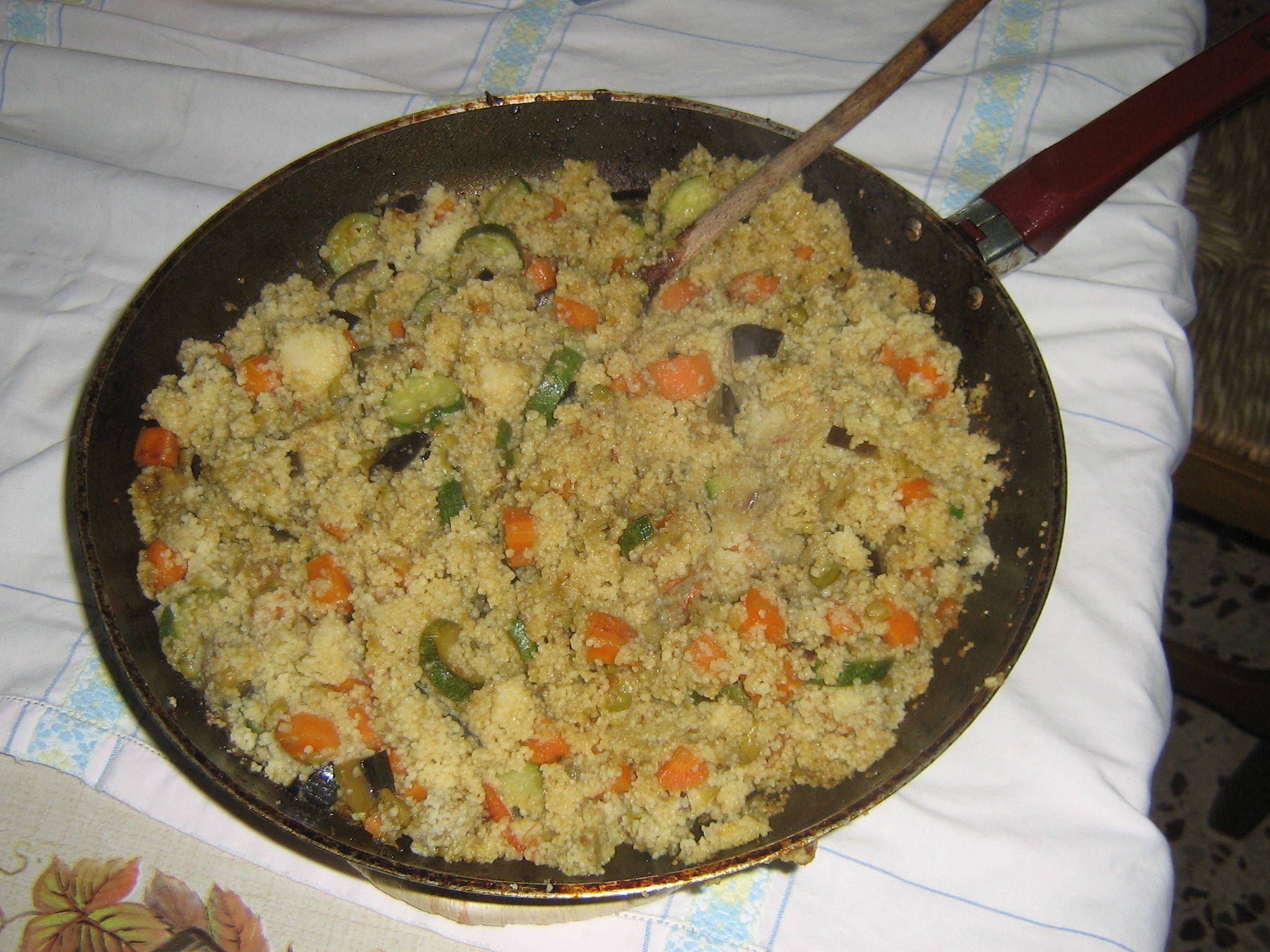 Quando il cous cous è pronto, sgranarlo bene con una forchetta poi versarlo nella padella con le verdure e far saltare per qualche minuto, amalgamando il tutto.