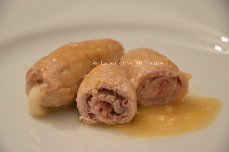 Per prima cosa è necessario stendere bene le fettine, aiutandovi magari con un batticarne. . Su ogni fetta ponete del prosciutto e del formaggio chiudete arrotolando la fettina su se stessa e fermate con uno stuzzicadenti. Infarinateli leggermente e metteteli a rosolare in una padella con un filo di olio extravergine di oliva, appena si saranno colorati spruzzate con abbondante marsala secco, fate evaporare e poi aggiungete due cucchiai di acqua coprite e cuocete per 5/6 minuti.