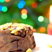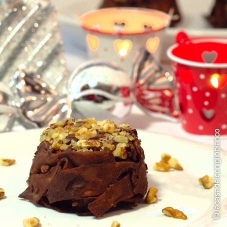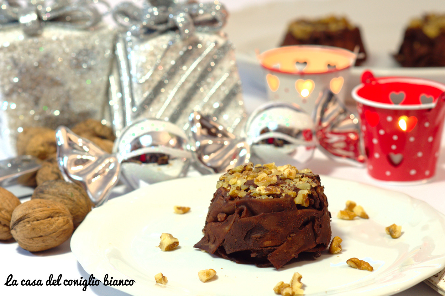 Preparare un recipiente con lo zucchero, il cacao amaro, il cioccolato fondente a scaglie, i biscotti secchi sbriciolati, la cannella e quasi tutte le noci. Lasciare una parte delle noci più grandi per decorare.