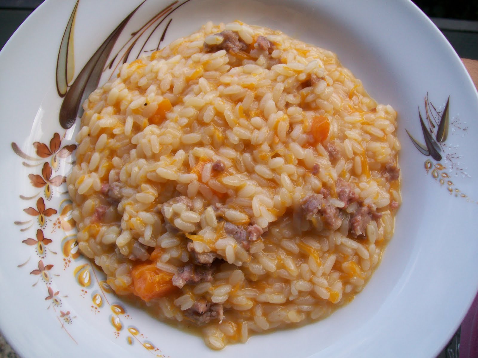 Aggiungete il riso, fatelo tostare nel condimento mescolando con un cucchiaio di legno. Cuocere il risotto con la zucca e la salsiccia aggiungendo il brodo bollente un mestolo per volta mescolando di tanto in tanto.