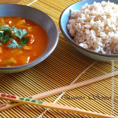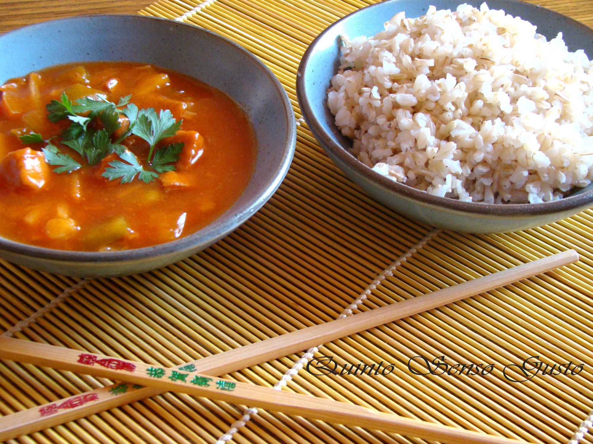 Versare nel wok l’ olio evo,e unire la cipolla affettata sottilmente,dopo circa 1 minuto aggiungere il pollo a tocchetti e rosolare a fiamma alta per qualche minuto. Togliere il pollo dal wok e mantenerlo coperto con della carta d’alluminio in una ciotola. Nello stesso condimento nel wok rimasto,versare la carota e il sedano tagliati a julienne,i germogli di bambù, l’ananas a fette e poi a cubetti, e i peperoni tagliati a listarelle; fare saltare il tutto per qualche minuto, unire un cucchiaio di zucchero e l’aceto. Una volta evaporato unire la salsa di soia,il concentrato di pomodoro,e mescolare, cuocere il tempo che le verdure si inteneriscano. Nel caso dovesse servire aggiungere dell’acqua va bene anche quella di cottura del riso,che intanto cuocerete in acqua bollente salata trascorso il tempo d’ammollo. Se la salsa dovesse risultare un po’ liquida potete addensarla facendo sciogliere in un po’ d’acqua calda 1 cucchiaino di amido di mais,e versarlo nella salsa, mescolare bene. Infine aggiungere il pollo tenuto da parte, aggiustare di sale nel caso servisse e grattugiare un po’ di radice di zenzero. Servire il riso insieme al pollo in un piatto da portata o in ciotoline individuali, a voi la scelta. Questa è la mia versione light ,la ricetta originale vuole la cottura del pollo fritto in pastella e aggiunto alla salsa.