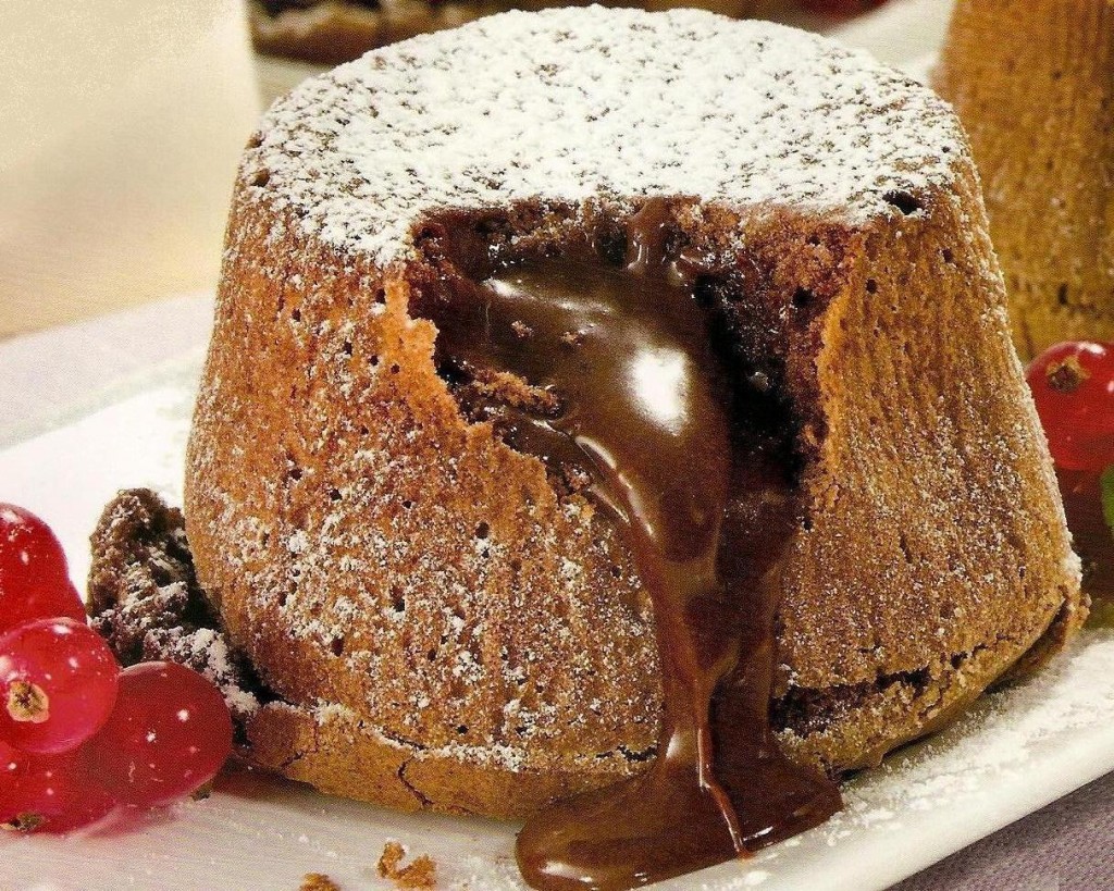 Togliete dal fuoco il composto di cioccolato e burro e, sempre sbattendo, incorporatelo al composto di uova; infine unite la farina e il cacao setacciati . A questo punto imburrate e ricoprite di cacao amaro in polvere gli stampini in alluminio, poi riempiteli per ¾ e infornateli nel forno già caldo a 180°; dopo 13-15 minuti (non uno di più) togliete i tortini dal forno, lasciateli leggermente intiepidire e poi capovolgeteli su di un piatto da portata, cospargeteli di zucchero a velo e serviteli ancora caldi.