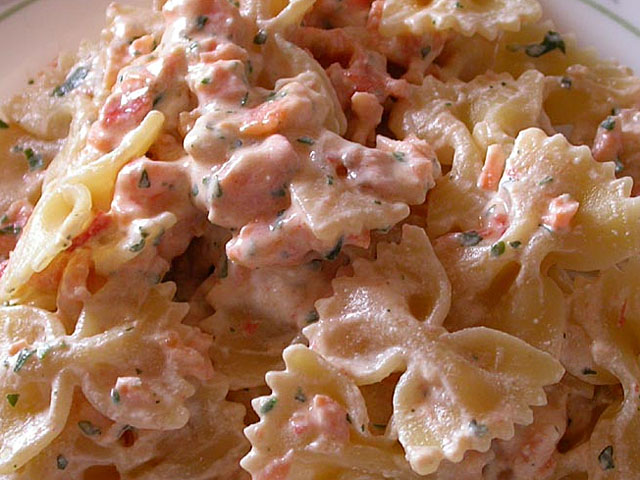 Scolate le farfalle al dente, versatele nella padella con il sugo al salmone e amalgamare il tutto dolcemente.