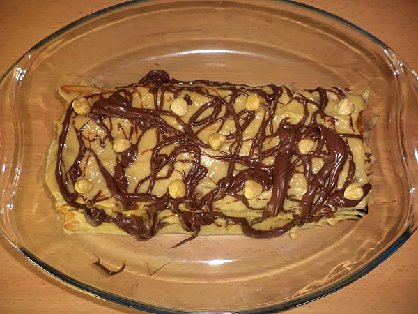 Guarnire la millefoglie facendo colare la nutella da una forchetta in modo da ottenere un effetto marmorizzato e ultimare la decorazione con delle nocciole intere.