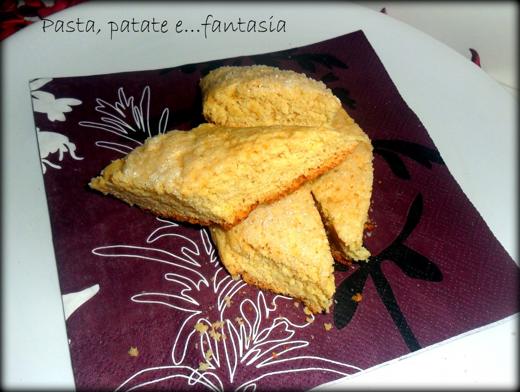 Mettere la farina su un tavolo formando la classica fontana, aggiungere il resto degli ingredienti al centro e lavorare come una normale frolla, ma con delicatezza. L’impasto deve risultare morbido, ma asciutto. Dividere l’impasto in 5 pezzi e formare dei rotolini. Adagiare i rotolini sulla placca foderata con carta forno, schiacciarli un po’, cospargerli di zucchero semolato e infornare a 180 per 15 minuti circa.