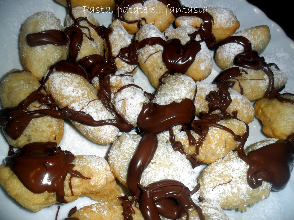 Friggerle in abbondante olio caldo per qualche secondo per lato. L’impasto sarà lievitatissimo e cuocerà velocemente. Poggiarle su carta assorbente per far assorbire l'olio in eccesso, metterle in un piatto da portata, spolverizzarle di zucchero a velo e guarnire con goccioloni di crema di cioccolato alle nocciole. Servire calde.