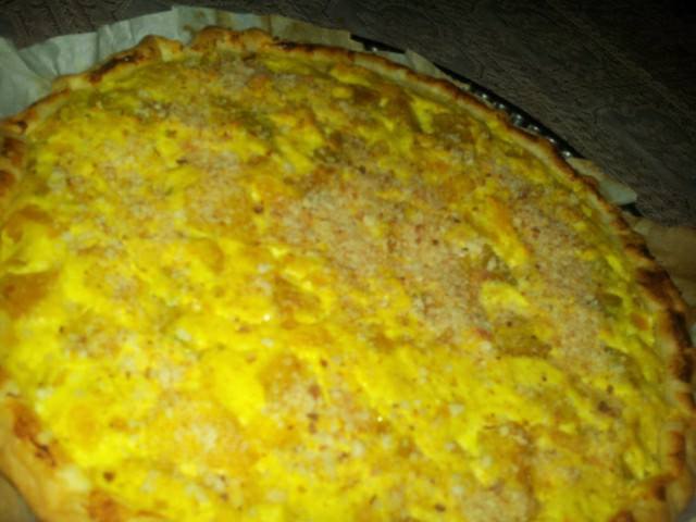 Stendere il rotolo di pasta sfoglia in una tortiera tonda, versare il composto e livellarlo